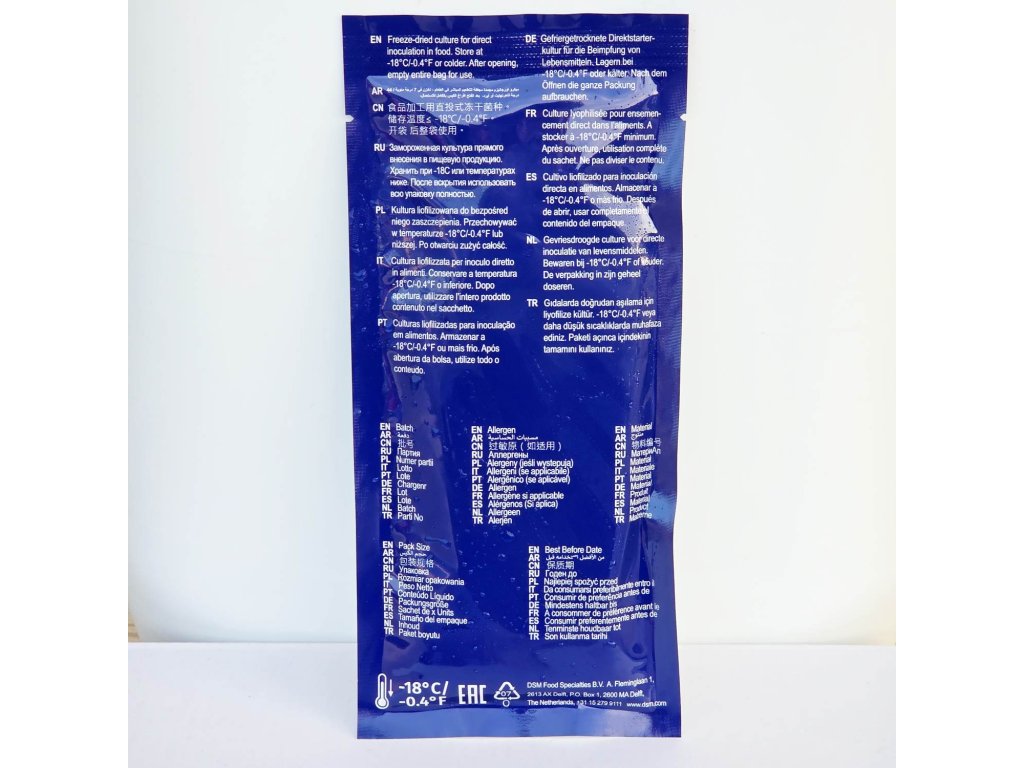 -18°C. Minimálna trvanlivosť vyznačená na obale. Po skončení min. trvanlivosti môžete kultúry bez problémov používať naďalej, môžu akurát postupne strácať silu.